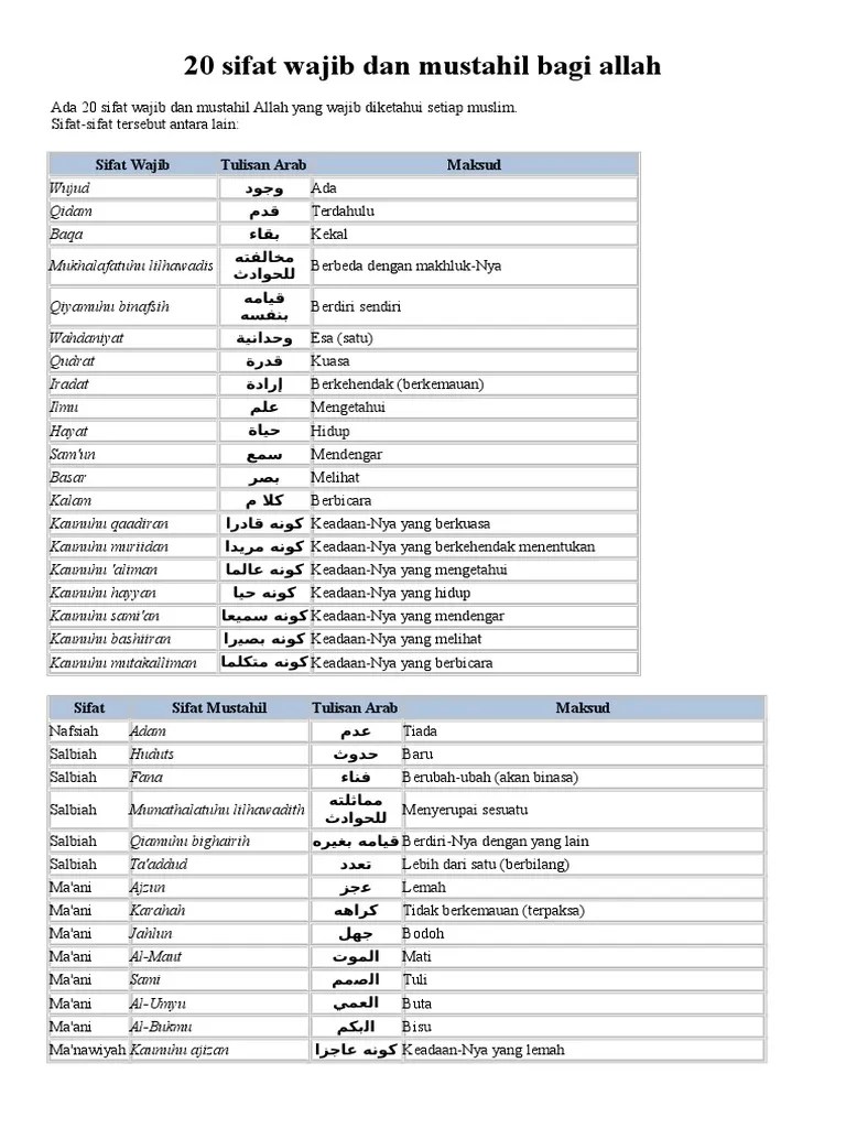 Ketahui 20 sifat mustahil bagi allah swt, agar kita semakin meningkatkan keimanan dan ketakwaan · sifat wajib, adalah sifat yang pasti dimiliki . Ada yang mendahului · fana artinya : Mumatsalatu lilhawaditsi, artinya menyerupai makhluknya.
