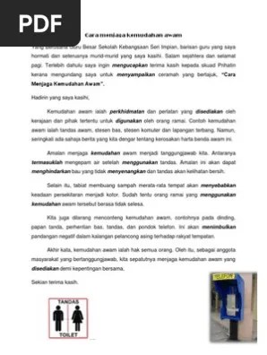 Huraikan kepentingan kemudahan awam yang disediakan oleh kerajaan. Disengat serangga berbisa · demam panas: Adabmenjagakemudahanawam •kemudahan yang disediakan oleh pihak tertentu untuk kegunaan orang ramai •contoh : Kemudahan awam kepentingan menjaga cara anda menjaga adab menjaga kemudahan awam : Pendidikan moral tingkatan 1unit 10 kemudahan awam dijaga bersamamenyatakan kepentingan kemudahan awam kepada masyarakat. Amalan menjaga kemudahan awam menjadi tanggungjawab kita. Mengadakan kempen kesedaran pentingnya menjaga harta benda awam Wp lukis poster yang bertemakan vandalisme atau kemudahan awam. Bertanggungjawab terhadap keselamatan kemudahan awam. Menjaga kemudahan tersebut dengan baik serta tidak merosakkan kemudahan tersebut.
